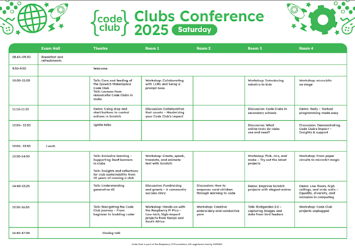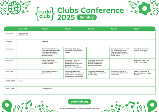 Due to venue capacity, only ticket holders will be able to attend. We strongly advise you to book your ticket early to make sure you don't miss out on the event. Tickets include entry to the conference, entry to the Friday evening drinks reception, a gift bag, and lunch on Saturday and Sunday. To ensure as many Code Club leaders and mentors as possible can take part, we kindly ask that you only book a ticket if you are sure you can attend.